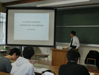 本学科1年生30名を対象に、IAEAの原子力安全基準の概要・基準・原則を詳しく解説して頂き、原子力発電プラントの設計・安全機能や、深層防護について詳しく説明して頂きました。また、主要各国の安全規制体制についても詳しく解説して頂きました。