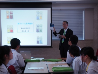 平成26年7月20日(日)本学福井キャンパスにおいて、独立行政法人科学技術振興機構 サイエンス・パートナーシップ・プログラム(SPP)採択事業による、平成26年度福井工業大学最先端科学実験教室「色の化学“ヴェルナーの錯体の世界 乾燥剤から新幹線まで”」を開催しました。丸岡高等学校と福井工業大学附属高等学校から17人が参加しました。午前は「錯イオンと金属錯体」のテーマでの、鈴木晉一郎教授の講義を受講していただき、錯体化学の歴史や錯体の構造と色の関係を示し、抗がん剤や新幹線の塗料、血液中のヘモグロビン等を例に、化学を理解する上で錯イオンや金属錯体に関する知識がいかに重要であるかを学んでいただきました。午後からは、「化学平衡を考える(塩化コバルト(Ⅱ)(Cobalt(Ⅱ)chloride)の色の変化を考える!)」の砂川武義教授の化学実験を体験していただきました。実験においては、塩化コバルトの水溶液をエタノールに入れると色が変化することや、濃い塩酸を加えた時の温度による反応の違いを学んでいただきました。「今回の講座はわかりやすく大変おもしろかった」との声をいただきました。