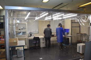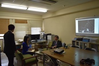 インタビュー後は、衛星データ利用研究紹介、衛星開発ルーム見学、本学あわらキャンパスに設置しております10mパラボラアンテナの見学、本プロジェクトに係る施設・設備等への取材を受けました。