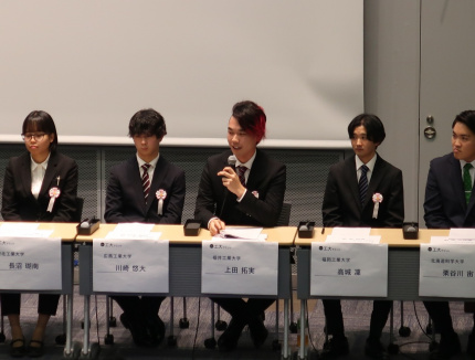 テーマAは、「工業教育の未来」と題して、各大学を代表する学生によるプレゼンテーションが行われ、本学からは、工学部 原子力技術応用工学科 4年 上田拓実さん(砂川研究室)が「大学での学びと将来について」と題して、「工業高校時代に学んだこと」「なぜ原子力技術応用工学科に進学したのか」「将来の目標」などについて発表し、意見交換が行われました。