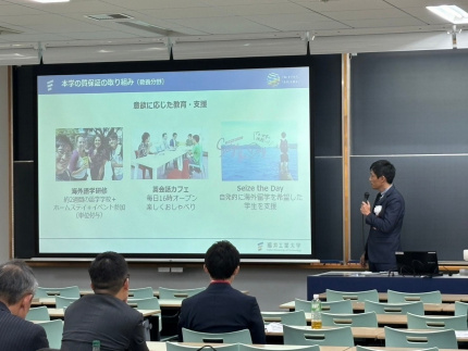 テーマBは、「工業教育の質保証」と題して、神奈川工科大学、神奈川県工業高等学校長会、静岡県工業高等学校長会、東京都立工業高等学校長会、本学からプレゼンテーションが行われました。本学からは、辻本学長補佐が「工科系総合大学としての質保証」と題して、「習熟度に応じた教育・支援」「授業評価・卒業生満足度アンケートの実施と活用」「GPS-Academicの実施」など、本学の取り組み事例を交えて質保証について説明しました。