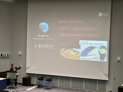 本学からは、掛下学長が「工業系高校と工業大学」と題して、「福井県及び周辺地域を取り巻く現状」「本学の学び・研究・支援体制」「教職課程・高大接続・高大連携」について説明しました。