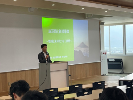 講義冒頭では、放送業界の現状と課題について、コロナ禍の影響により、テレビ離れとインターネット普及が加速したことやテレビ・ラジオ由来のデジタル広告が成長していることを説明されました。