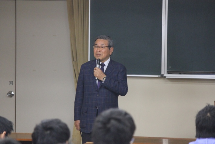 本学は、鯖江市・鯖江商工会議所と産業、学術、文化、教育などの分野における相互協力協定を結んでおり、牧野鯖江市長のご講演に、多くの学生諸君は熱心に聴講していました。
