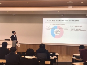 講義冒頭、ご自身が作成された番組「俵太の達者でござる」の動画紹介があり、テレビ産業のビジネスモデルについてお話されました。また、テレビ局をめぐる環境として、インターネットの躍進による広告費の変化についてグラフ等を用いて説明されました。