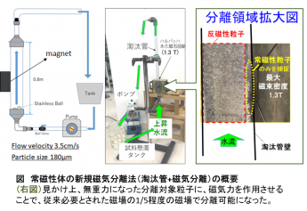 具体的には淘汰管を用い、分離対象物に作用する重力とドラッグ力のつり合い(終端速度)を利用し,上昇流を制御することで、粒子を停留(浮遊)状態にし、見かけ上、無重力状態にある常磁性粒子に対し、磁気力を作用させるような新たな磁気分離法を開発しました。