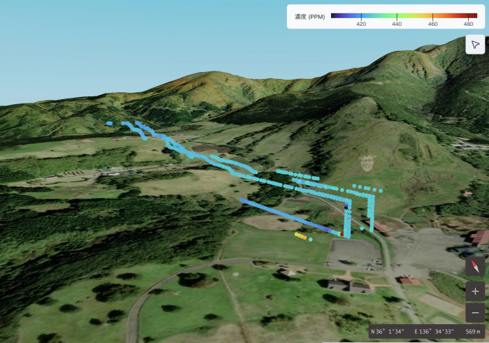 研究当初より、ドローンに搭載するオリジナルのCO2観測機器(SIRAVERU, 図左)と解析ソフト(ALAVAS)の開発を進め、2023年11月には福井県大野市六呂師高原で最初の試験飛行を行うことができました。高度50m、往復距離2.4kmのCO2濃度が2秒間隔で取得できました。解析ソフトにより観測データの3D化にも成功しています。