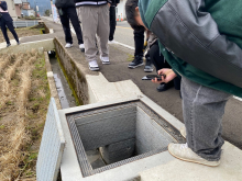 見学会には、本学の学生の他に行政や建設会社の担当者を含め、約100名が参加。さらに、2022年度に福井県で初めて山一建設が導入・施工された建設用3Dプリンターによるコンクリート集水桝の現場を見学しました。