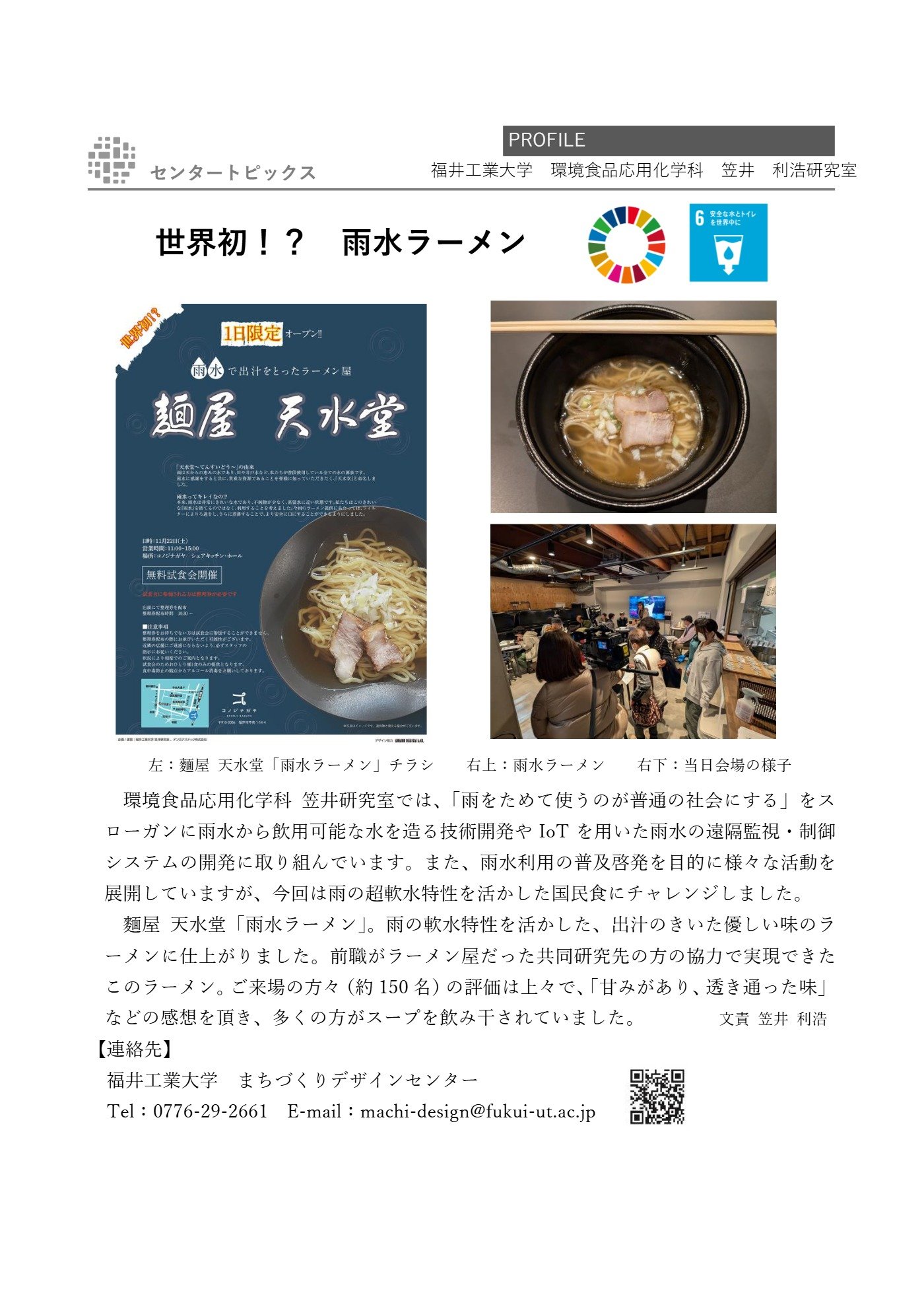 麵屋 天水堂「雨水ラーメン」。雨の軟水特性を活かした、出汁のきいた優しい味のラーメンに仕上がりました。前職がラーメン屋だった共同研究先の方の協力で実現できたこのラーメン。ご来場の方々(約150名)の評価は上々で、「甘みがあり、透き通った味」などの感想を頂き、多くの方がスープを飲み干されていました。