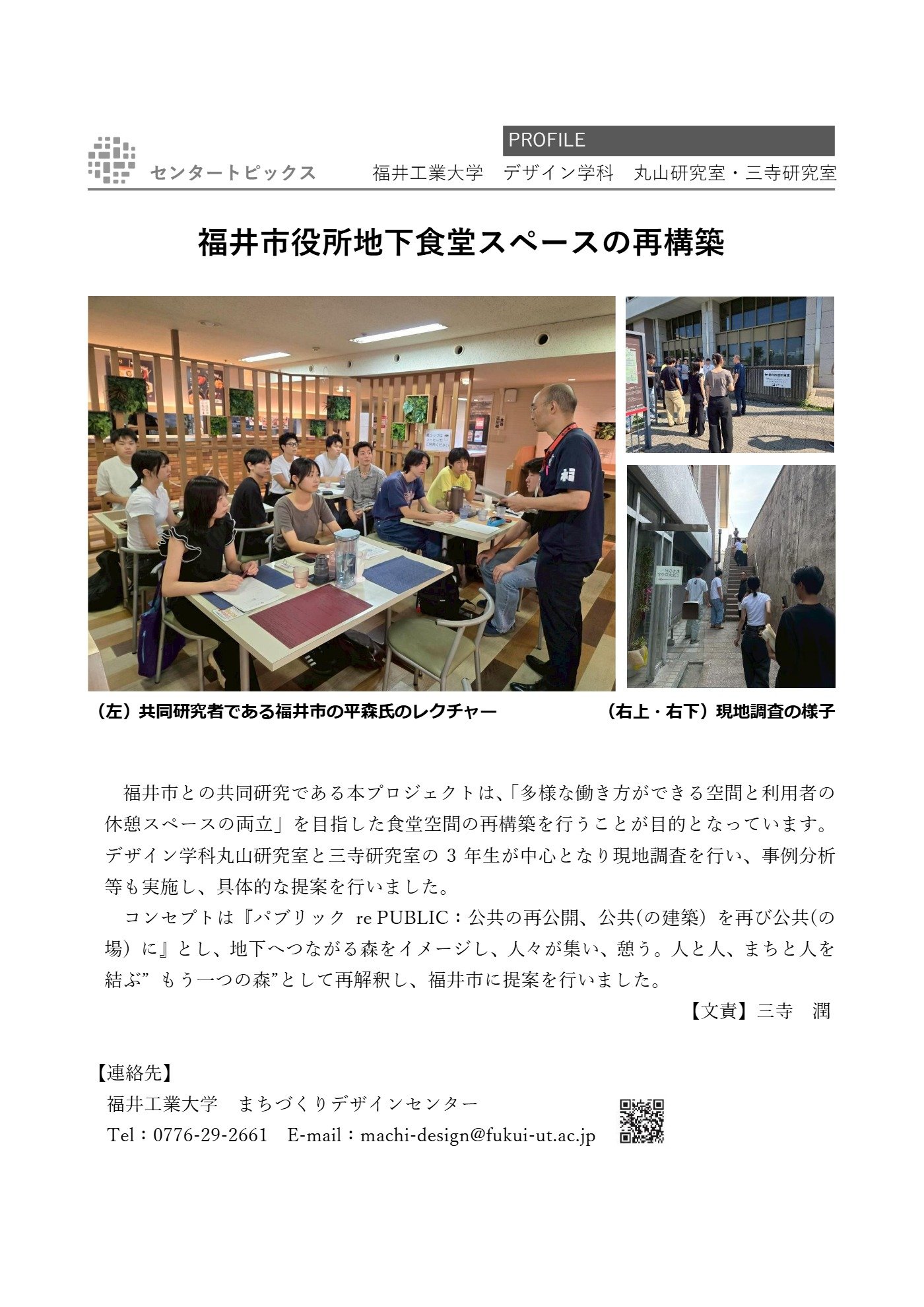 デザイン学科丸山研究室と三寺研究室の3年生が中心となり現地調査を行い、事例分析等も実施し、具体的な提案を行いました。
