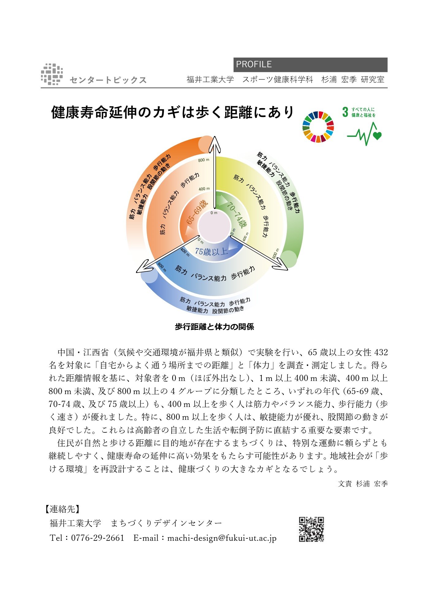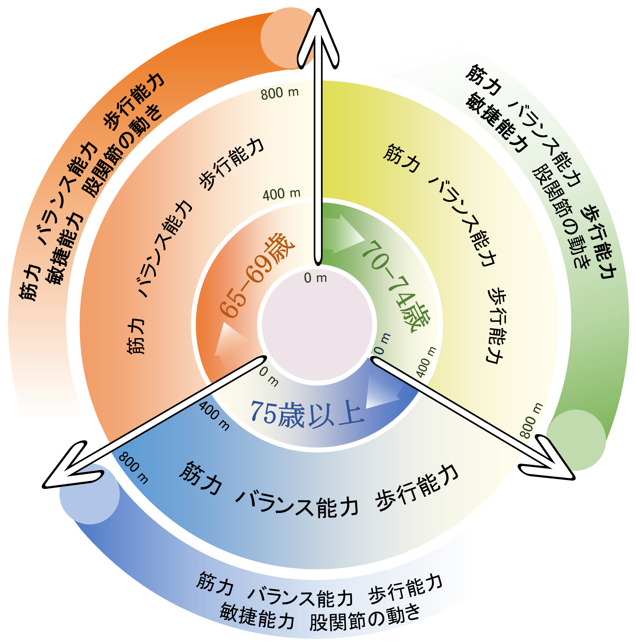 中国・江西省(気候や交通環境が福井県と類似)で実験を行い、65歳以上の女性432名を対象に「自宅からよく通う場所までの距離」と「体力」を調査・測定しました。得られた距離情報を基に、対象者を0 m(ほぼ外出なし)、1 m以上400 m未満、400 m以上800 m未満、及び800 m以上の4グループに分類したところ、いずれの年代(65-69歳、70-74歳、及び75歳以上)も、400 m以上を歩く人は筋力やバランス能力、歩行能力(歩く速さ)が優れました。特に、800 m以上を歩く人は、敏捷能力が優れ、股関節の動きが良好でした。これらは高齢者の自立した生活や転倒予防に直結する重要な要素です。