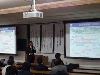 まず、山中伸介氏には「福井工大・阪大連携を中心とした新しい大学間協力」と題し原子力分野における教育研究協力の今後の可能性についてお話いただきました。次に、西嶋茂宏氏には「福島の除染と材料科学の新展開」と題し、福島での除染についての最新の研究・対策をご説明いただきました。さらに、粟津邦男氏による「量子放射・レーザーによる難病治療の最前線」と題した講演では、レーザーを利用した最新の癌などの難病治療最前線を映像等を用いてご紹介いただきました。