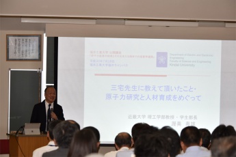 今回の講座は基調講演と聴講者とのフリートーク、さらに卒業生、在校生による仕事や研究の現況発表の3部構成で行われ、基調講演では、「産学官連携による地域イノベーション創出に向けた取組み」(文部科学省科学技術・学術政策局産業連携・地域支援課長 西條正明氏)、「原子力産業の現状と見通しおよび将来を担う人材」(関西電力株式会社代表取締役副社長兼原子力事業本部長 豊松秀己氏)、「三宅正宣先生に教えて頂いたこと・原子力研究と人材育成をめぐって」(近畿大学理工学部教授兼学生部長 渥美寿雄氏)について発表がありました。