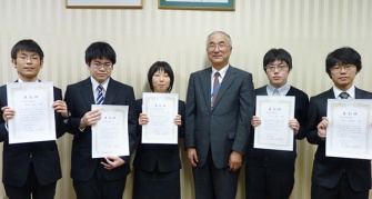 創成科学の受賞者は、レポートの査読などにより選ばれた学生の中から決定されます。平成25年度創成科学Ⅰでは5名の学生が「創成科学優秀賞」に選ばれました。授賞した5名には平成25年11月13日(水)「平成25年度創成科学Ⅰ表彰式」が行われ、表彰状が授与されました。