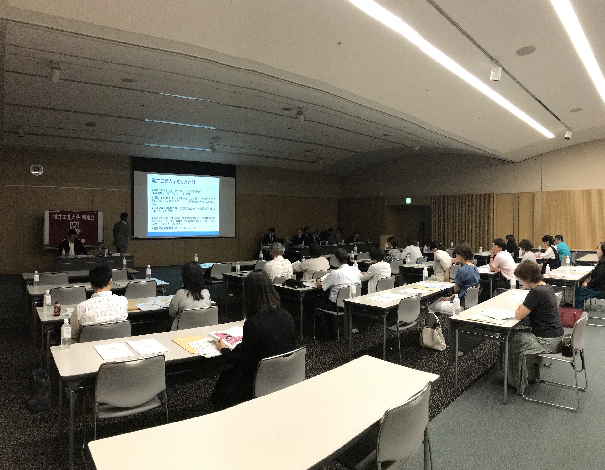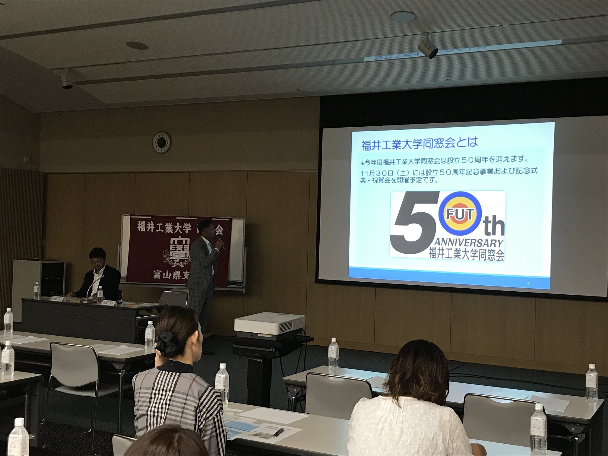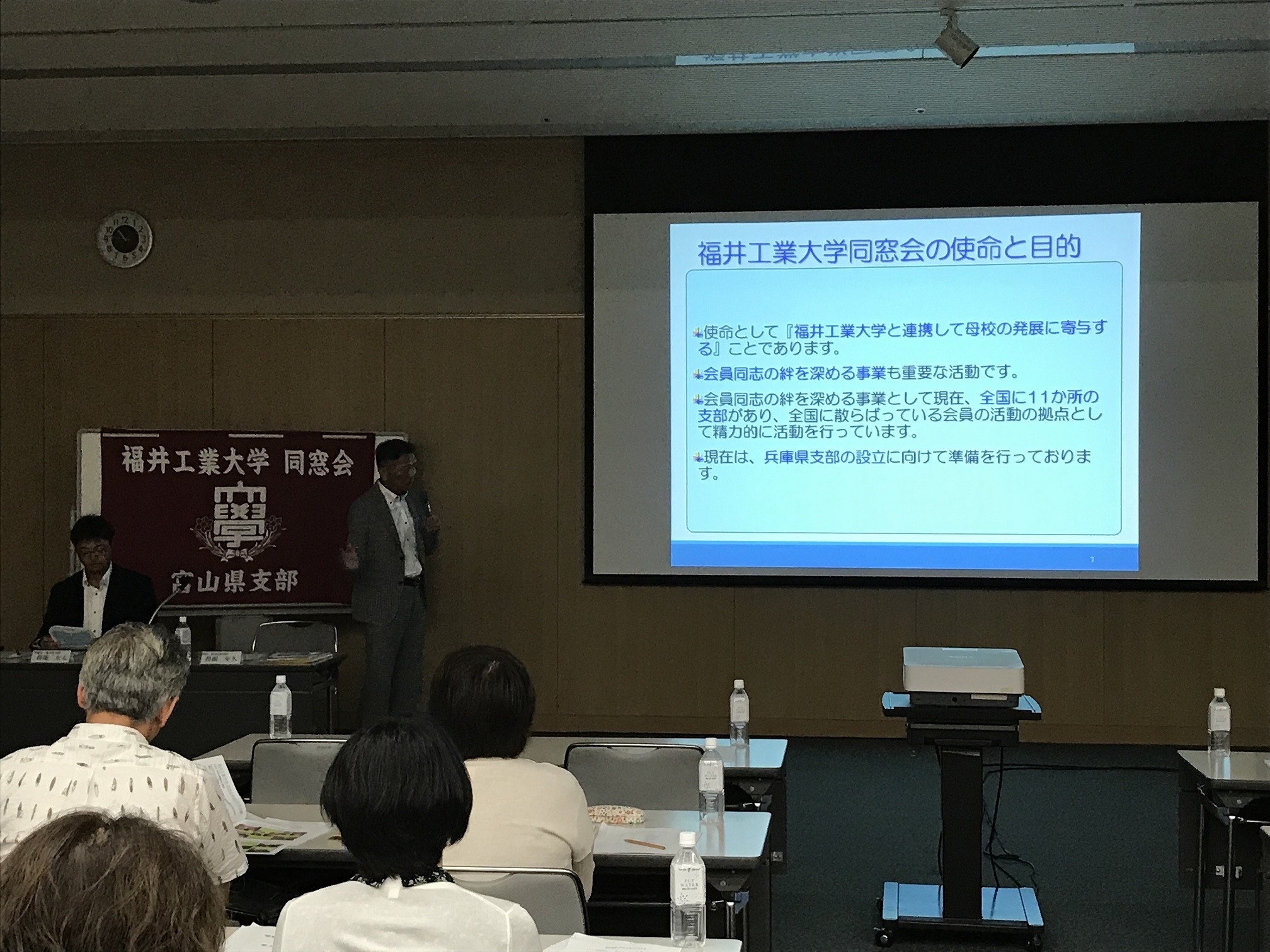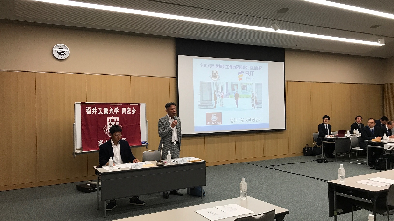 2019年6月30日(日)富山国際会議場(富山県)にて開催されました「福井工業大学後援会主催地区懇談会(富山会場)」において、同窓会富山県支部より得能支部長、富山県支部会員(得能友太 氏)ら2名が出席しました。 大学からの教育の現状報告がなされた後、同窓会を代表して得能支部長が資料を基に福井工業大学同窓会及び富山県支部について紹介され、同窓会会員の状況や各支部活動について説明されました。懇親会では昼食を交えながら出席者全員での懇談があり、会話も弾む和やかな会となりました。