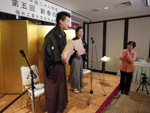 宮崎書記局長の司会で開催です。福井工業大学学歌斉唱を行った後、