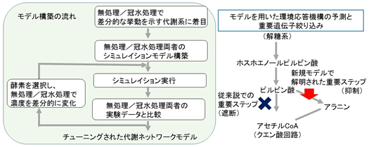 モデル構築と実験データの投入による検証により、ダイズの冠水ストレスに対する応答には赤矢印で示される経路も重要であることが判明しました。