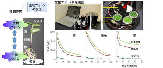 オミクス解析の利用により明らかになった活性酸素消去系の関与を利用して、地下部で発生した湿害を地上部で生物フォトンとして検出することが可能となりました。