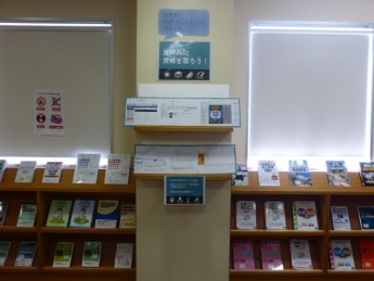 新しく購入した資格書を展示しています。資格の勉強には涼しくて快適な図書館を利用してください。