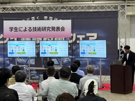 また、会期中のイベントとして「学生による技術研究発表会」が実施され、工学部建築土木工学科4年生の2名がプレゼン発表しました。