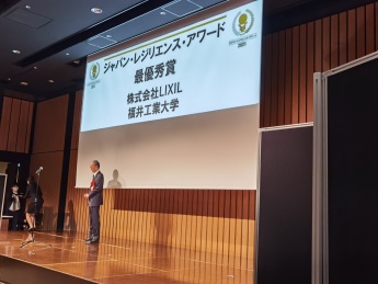 本学環境情報学部 環境食品応用化学科 笠井利浩 教授と株式会社LIXILとの共同事業「雨水を水源とした自立分散型スマート雨水利用システムとレジリエンストイレの設置による離島における水まわり生活の質の向上」が、ジャパン・レジリエンス・アワード(強靭化大賞)2021※の最優秀賞を受賞し、2021年3月18日に赤坂インターシティ4階”the AIR"(東京都港区)で表彰されました。