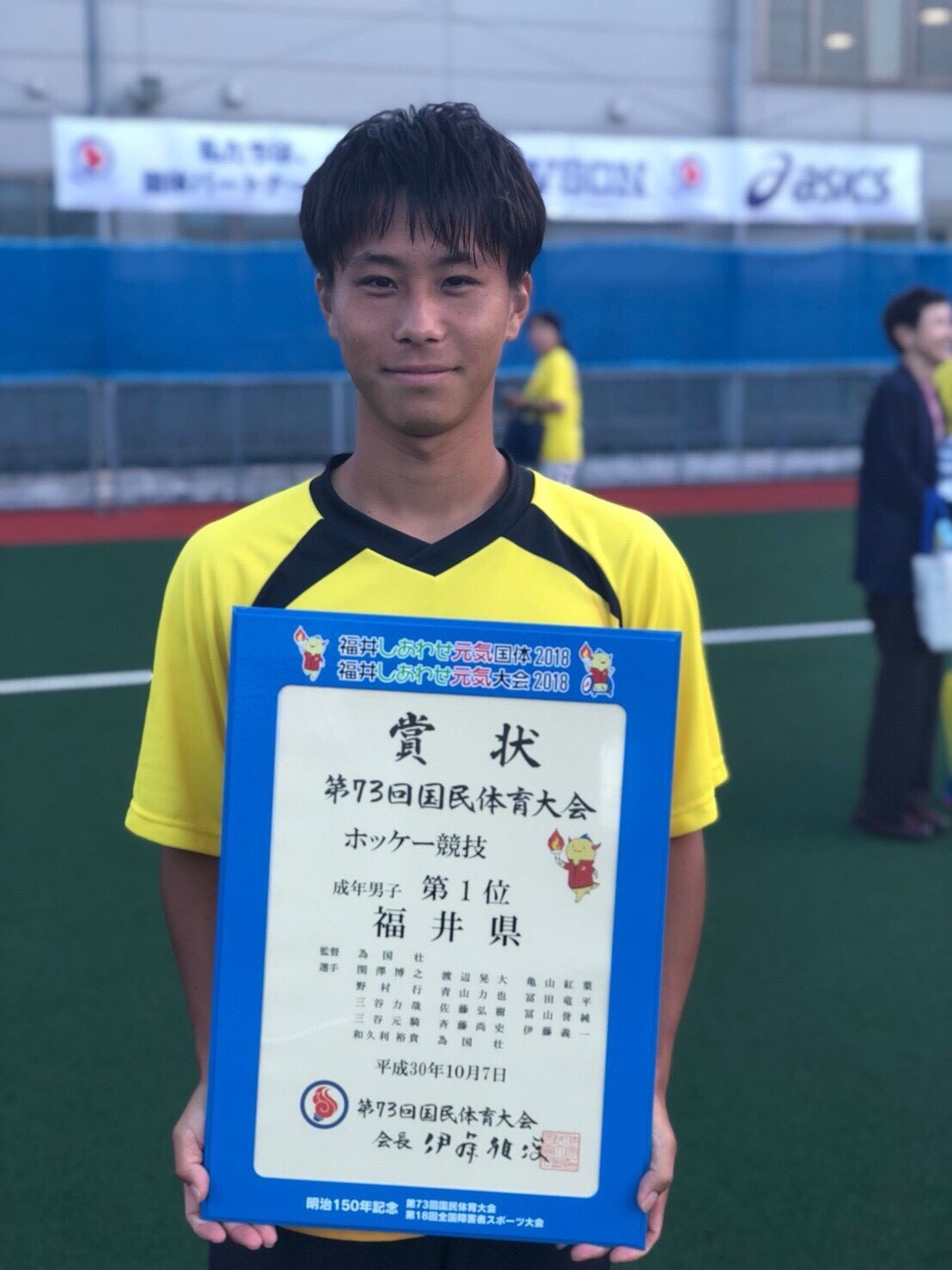 10月7日に越前町営朝日総合運動場で開催された第73回国民体育大会「福井しあわせ元気国体」ホッケー成年男子決勝戦において、福井県が優勝を果たしました。