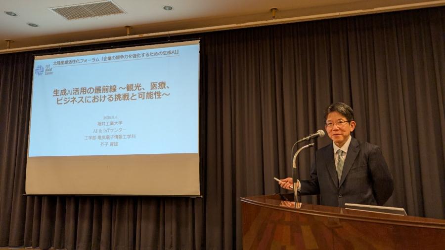 3月4日午後1時半より、北陸産業活性化センター主催の「北陸産業活性化フォーラム」にて、『企業の競争力を強化するための生成AI』をテーマに福井工業大学AI&IoTセンター長 芥子育雄 教授(工学部 電気電子情報工学科)が基調講演を行いました。