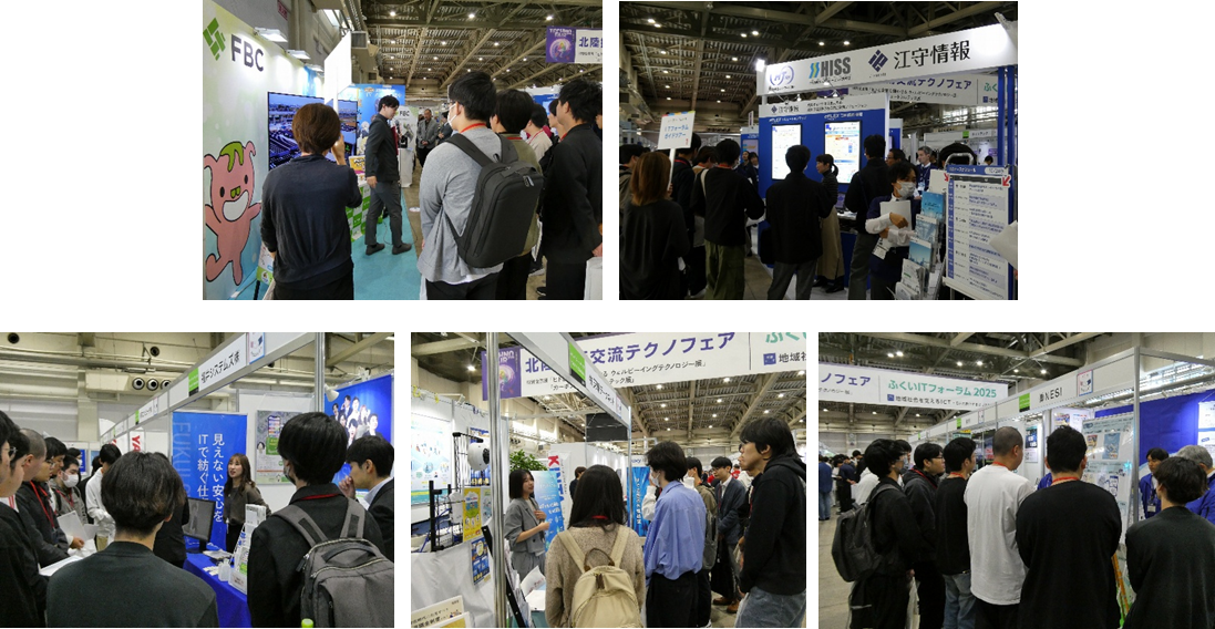 福井県産業会館で開催された「ふくいITフォーラム2025」において、10月24日(金)午前10時から90分間に渡り、電気電子情報工学科の3年生約50名が、ソフトウェア工学の授業の一環として、5班に分かれて福井県内のIT企業11社のブースを訪問しました。