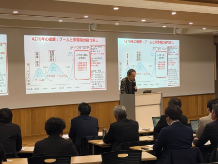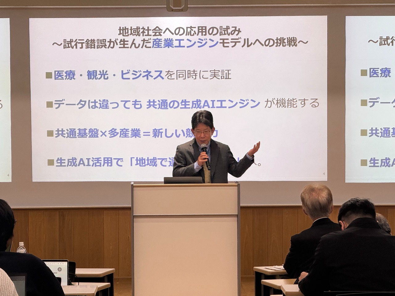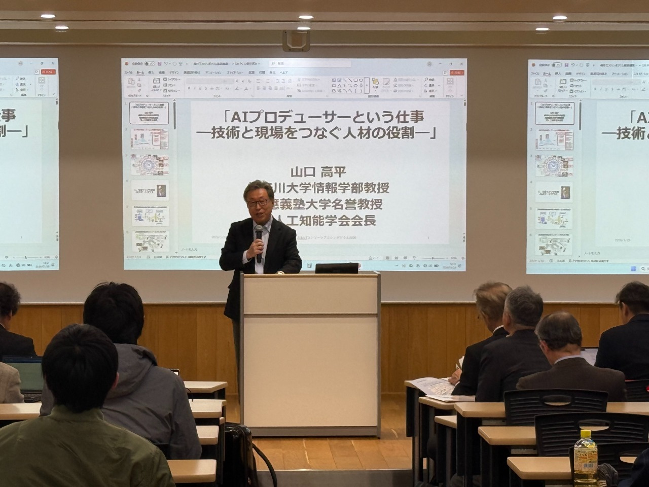 基調講演では、山口高平氏から「AIプロデューサーという仕事―技術と現場をつなぐ人材の役割―」について、増井俊之氏から「Helpfeel Cosenseで変わるナレッジ共有―AIをチームに迎え入れる―」についてのご講演をいただき、その後は芥子センター長からは「福井発・AI実践研究 ―医療・観光・ビジネス分野での産学連携の挑戦―」と題しAI&IoTコンソーシアム活動報告がされました。