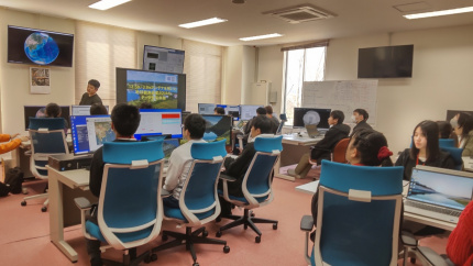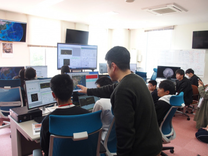 衛星リモートセンシングに関する説明、3.9mパラボラアンテナの見学会、13.5mパラボラアンテナのコントロール体験、AQUA衛星からの受信体験、受信データの画像処理体験を実施しました。