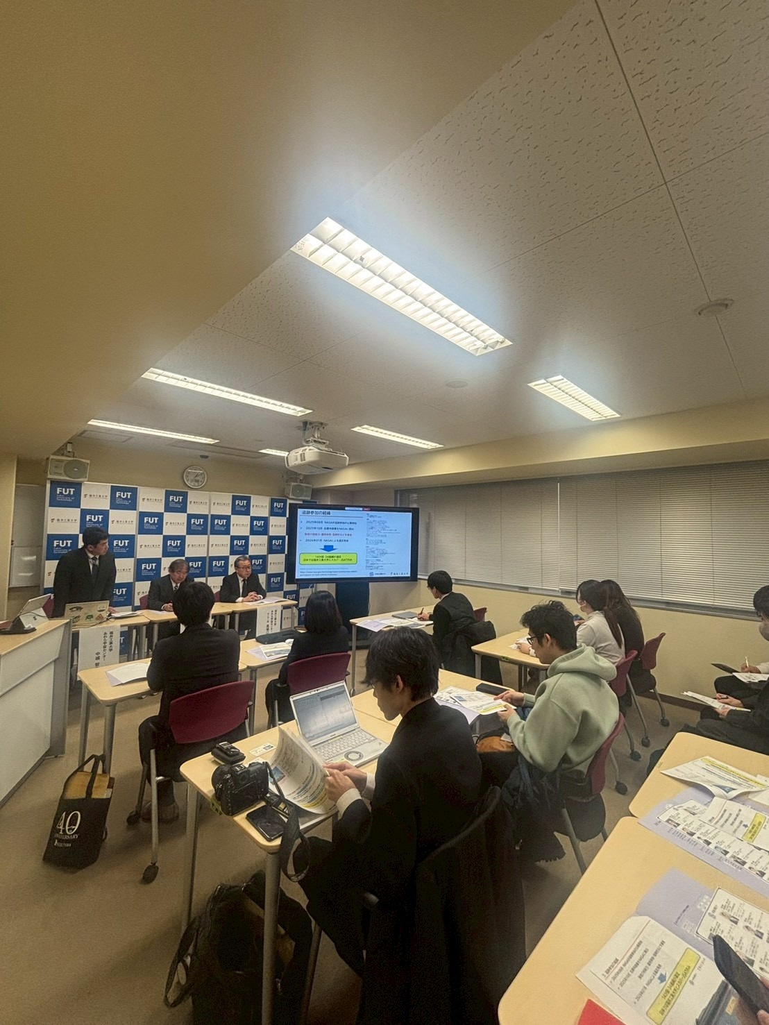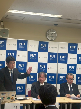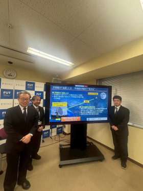 記者会見では、福井工業大学あわら宇宙センター センター長 馬場口 登 教授、副センター長 村田 泰宏 教授、センター員 中城 智之 教授から、「今回、NASA は世界中の地上局の中から、受信の技術力・運用体制・信頼性などを審査したうえで 14 か国・34 の組織/個人を選定したこと」「本学が日本から参加する唯一の大学地上局となること」「本学が公式トラッキング協力局として選定された経緯」などを報告しました。