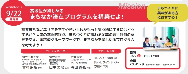 お知らせ NEWS & TOPICS トップページ お知らせ まちづくりデザインセンター 「高校生が楽しめるまちなか滞在プログラムを構築せよ!」が開催されます! 2024.08.08 「高校生が楽しめるまちなか滞在プログラムを構築せよ!」が開催されます! 「Feel Fukui's Fun進路探求ワークショップ」の一環として、高校1,2年生を対象とした講座が開催されます。 FUTまちづくりデザインセンター 副センター長、工学部 建築土木工学科 吉村 朋矩教授もコーディネーターとして参加します。 ぜひご参加ください! 『高校生が楽しめるまちなか滞在プログラムを構築せよ!』 開講日:令和6年9月22日(日)13:00~17:00(12:30受付) 会 場:Xスタンド(福井市中央1丁目9-24 福井中央ビル4F) 詳細・お申し込みは下記チラシをご覧ください。 お問い合わせ:社会連携推進課 PREV 一覧に戻る NEXT