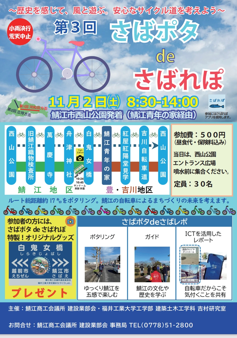 鯖江市商工会議所と工学部 建築土木工学科 吉村研究室主催の『第3回「さばポタ de さばれぽ」〜歴史を感じて、風と遊ぶ。安心なサイクル道を考えよう~』を開催します。