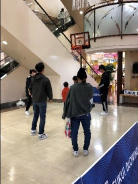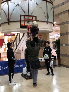 両日、福井ブローウィンズのスタッフ(2名)とともに、ふくい県民応援チーム「FUKUIRAYS」である本学男子ホッケー部員(1日目6名、2日目5名)が参加し、多くの子どもたちにバスケットボールのシュートを体験して頂きました。