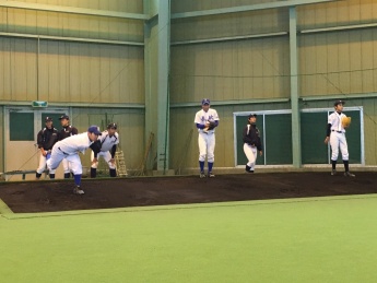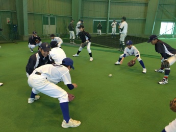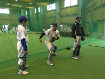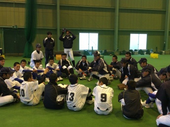 当日は、本学硬式野球部 下野監督の挨拶で幕を開け、ウォーミングアップ、打撃練習、ポジションに分かれての守備練習、質疑応答といった流れで行われ、最初は緊張気味だった中学生も、大学生と色々な会話をしながら指導を受けるなかで、段々緊張もほぐれ、最後の質疑応答では普段疑問に思っている事など、たくさんの質問がでていました。