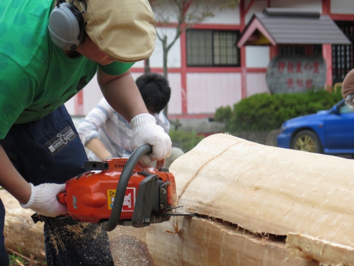 学生たちはチェンソーなど機器の使い方を学びながら、間伐材の伐採から切り出した丸太を利用した作品制作まで、4日間テントで宿泊しながら行います。