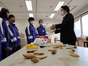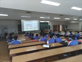 デザイン学科の川島教授と機械工学科の井藤教授から大学概要と大学の面白さについてお話を頂き、大学PVの視聴、授業見学(機械工学科、建築土木工学科、経営情報学科、デザイン学科)、施設見学を行いました。