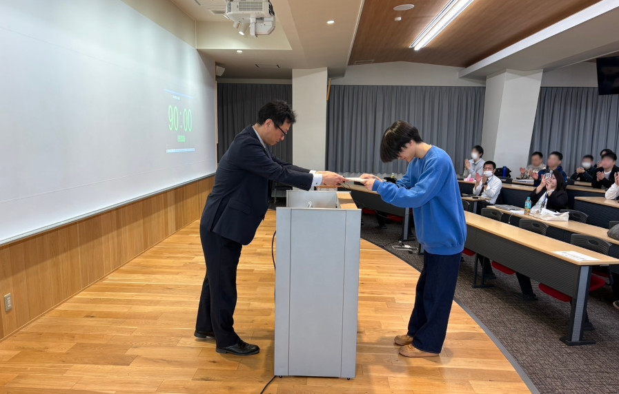また、各講義に先立ち、3年生(現4年生)の創造工学実験表彰式が行われ、最優秀発表賞に道場創雅君、優秀発表賞に南部圭亮君と小林歩夢君が受賞しました。
