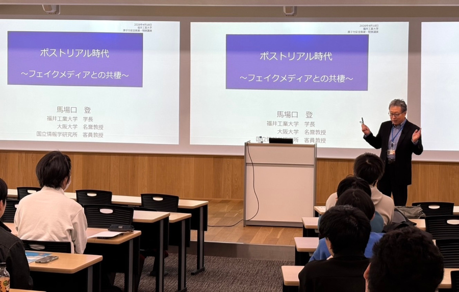 今年の特別講演は、この4月に新しく学長およびアイソトープ研究所所長に就任した 馬場口 登 教授より「ポストリアル時代 ~フェイクメディアとの共棲~」のテーマで実施しました。講演では、生成AIによるフェイクメディアが横行する時代となり、本物か偽物かを見分けるのが困難になりつつある現状が示されました。これは原子力や放射線の話題についても同様で、原子力技術者としてどのように向き合うかを考えるきっかけになり、大変な刺激となりました。