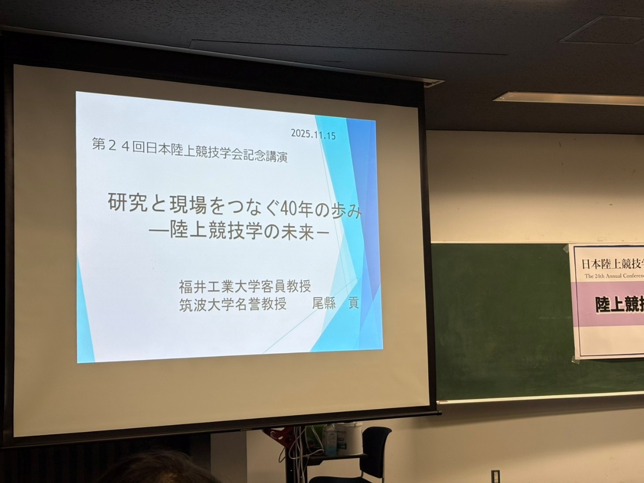 お知らせ NEWS & TOPICS トップページ お知らせ 教育・研究情報 【スポーツ健康科学科】日本陸上競技学会で講演を行いました。 2025.11.20 【スポーツ健康科学科】日本陸上競技学会で講演を行いました。 11月15日(土)~11月16日(日)に行われた第24回日本陸上競技学会大会(筑波大学,茨城県)において,尾縣貢 本学客員教授が「研究と実践をつなぐ40年の歩み ー陸上競技学の未来ー」のタイトルで記念講演を行いました。また,スポーツ健康科学科 山元康平 准教授がシンポジウム「陸上競技における実践研究の質保証」にシンポジストとして登壇し,本学卒業生でパリ2024パラリンピック銅メダリストの川上秀太選手(アスピカ)と本学陸上競技部監督 内藤景 教授の活動をテーマにした研究の紹介を行いました。 お問い合わせ:スポーツ健康科学科 PREV 一覧に戻る NEXT