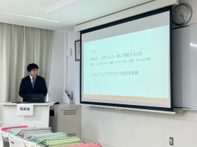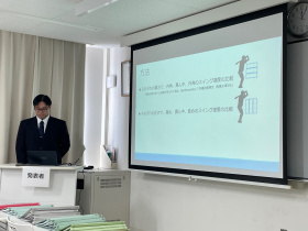 スポーツ健康科学科では12名の教員がそれぞれの研究室で学生の研究指導を行っており、学生は1年以上にわたって指導教員とともに取り組んだ研究成果を5分間で発表し、2名の質疑担当教員からの質問に回答しました。健康科学、幼児の体力、スポーツ科学、トレーニング法、コーチングや障がい者スポーツ等の様々なテーマの研究発表が行われ、科学的な考察や指導現場への示唆について議論が行われました。