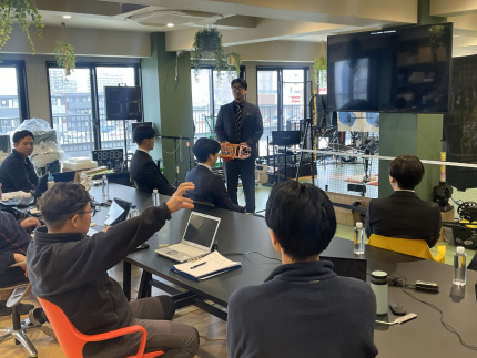 そのアイデアをより良いものにするため、1/28(水)に、スポーツ健康科学科3年のプロジェクトメンバー4人が、スポーツ用品の企画制作、製造、販売等を行う株式会社フィールドフォースを訪問し、開発メンバーの方々を前に試作品のプレゼンテーションを行いました。