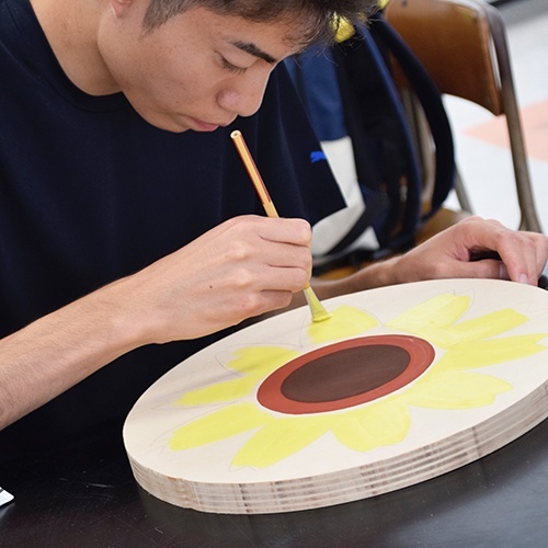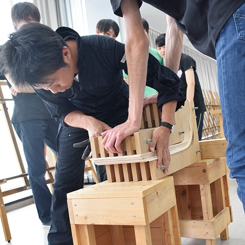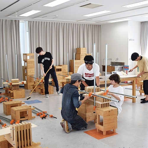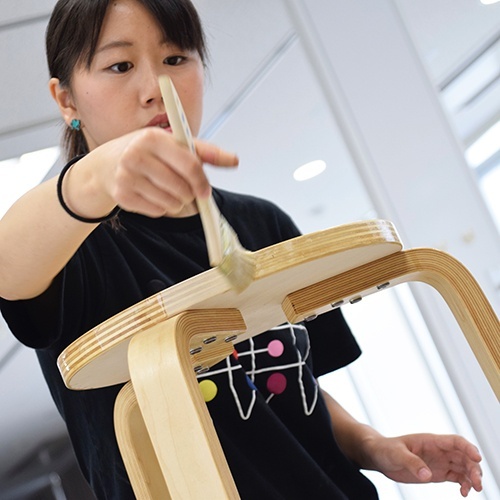 デザイン学科の夏季集中講義「家具製作演習」(2年生)が、8月27日から31日まで開講されました。この授業では、成形合板※の技術を学びながら3本脚のストゥールを実際に制作します。講師は、家具デザイナーの多田羅景太先生。京都とデンマークで家具を学び、自ら製作も手がける多田羅先生のご指導で、本学SSLデザイン工房の本格的な工作機械を使って、デザインと制作技術を実践的に学びます。学生たちは思い思いのイラストを描き、自分だけのイスを生み出すことに夢中になっていました。今年の作品はSSLデザイン工房前面のギャラリースペースで展示中です。
