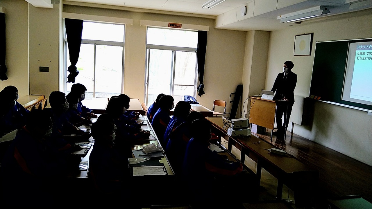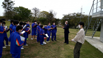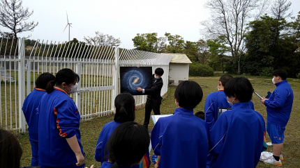 令和5年4月14日(金)、福井工業大学あわらキャンパスにて行われた附属福井中学校「新入生オリエンテーション」の中で、衛星通信地上局の見学会を実施し、中学1年生77名にご参加いただきました。本見学会では、ミニ講義やパラボラアンテナの見学などを通じて、福井工業大学で行われている宇宙研究について紹介を行いました。