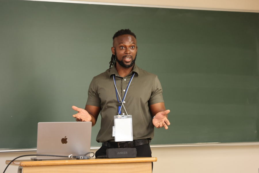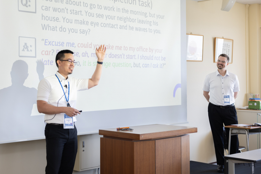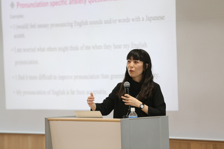 メインスピーカーは、ダン・イズベル博士(本学連携協定校、ハワイ大学マノア校)と鈴木田優衣博士(順天堂大学・ユニバーシティ・カレッジ・ロンドン)のお二人で、イズベル博士は言語評価におけるA.I.テクノロジーの進歩について、鈴木田博士は音声知覚のプロセスについて講演されました。