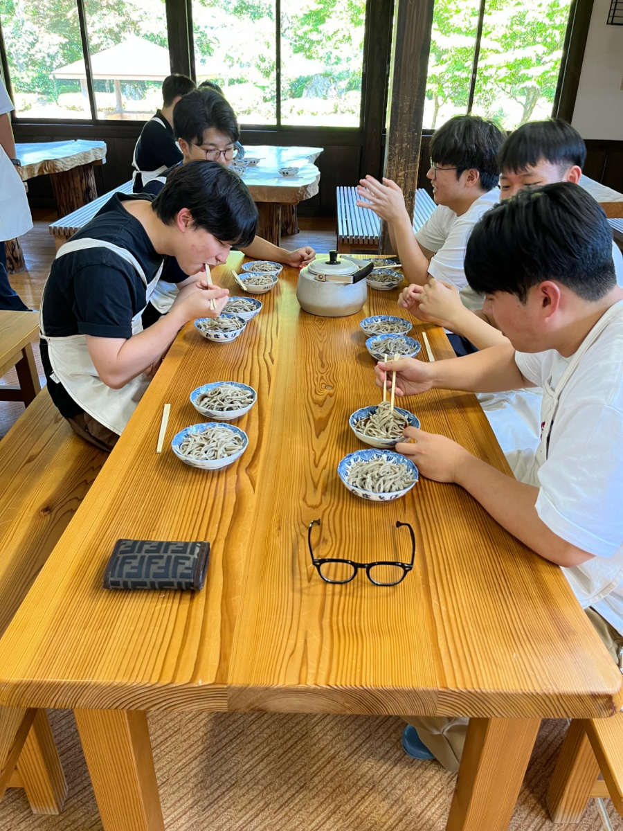地元の職人の指導のもと、自ら蕎麦を打つ日本食文化の体験を行いました。