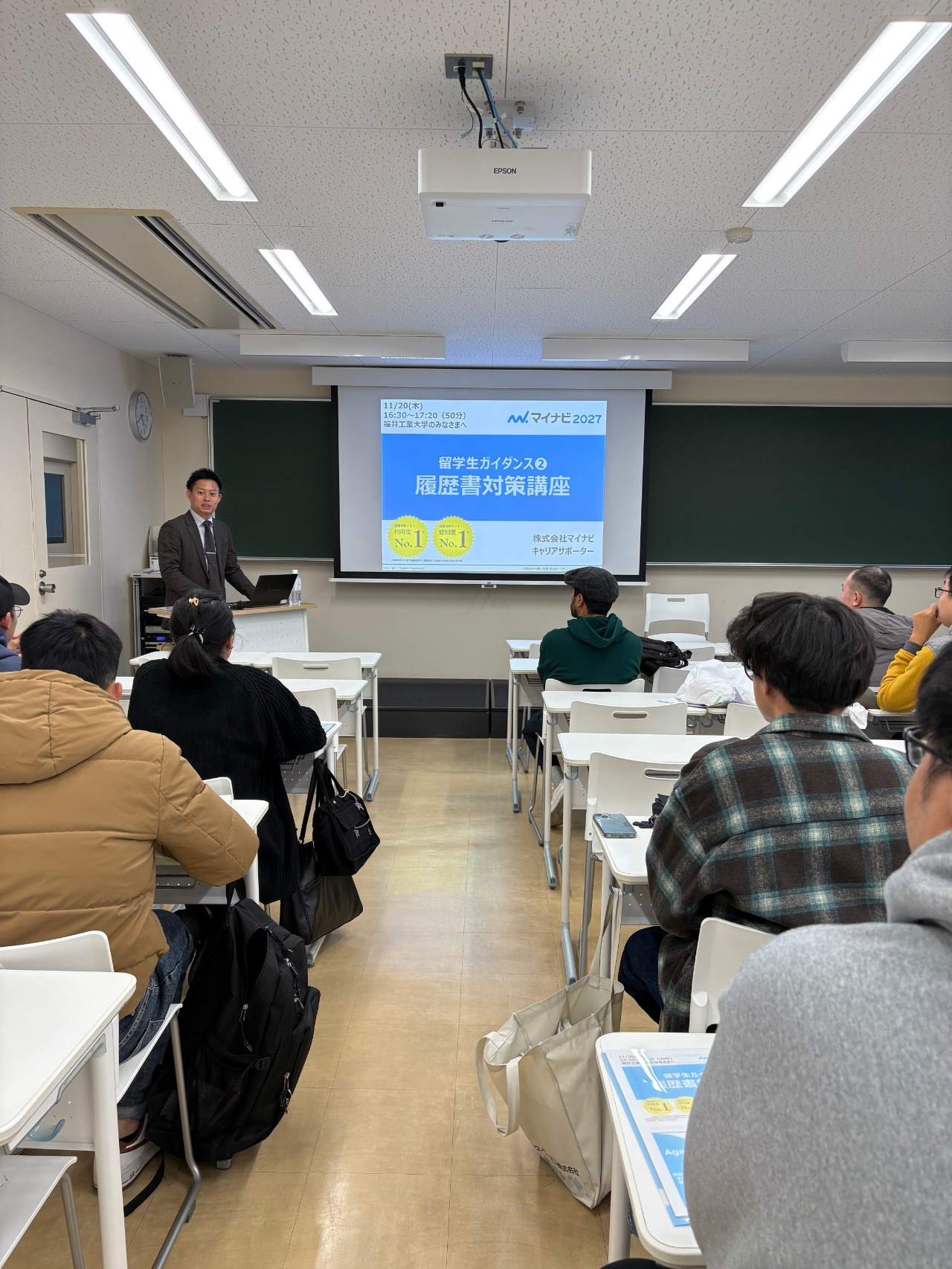 お知らせ NEWS & TOPICS トップページ お知らせ インターナショナルセンター 令和7年度留学生就職ガイダンス(第2回)が開催されました 2025.11.21 令和7年度留学生就職ガイダンス(第2回)が開催されました 令和7年11月20日(木)、学部3年生および大学院1年生を対象とした「第2回 留学生就職ガイダンス」を開催しました。当日は、株式会社マイナビ様による「履歴書作成講座」が行われ、続いて本学4年生の先輩留学生による就活対談も実施しました。 国内就職を希望する留学生11名が参加し、講師からは外国人留学生の就職状況、日本と海外における就職活動の違い、履歴書作成のポイントなどについて、わかりやすくご説明いただきました。参加した留学生たちは、熱心にメモを取りながら耳を傾け、今後の就職活動に向けて理解を深めていました。 お問い合わせ:インターナショナルセンター 一覧に戻る NEXT