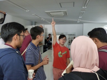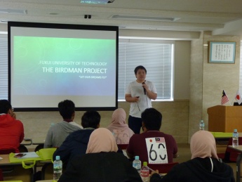 はじめに、尾崎インターナショナルセンター長が本学を代表して歓迎の挨拶を行いました。続けて、福井県や本学の説明、鳥人間プロジェクト(※)の紹介が行われました。競技のルールや機体完成までのスケジュール等一連の説明に興味を示している様子でした。その後、マレーシアの学部生3名を交え施設見学、懇談会を行い交流を深めました。