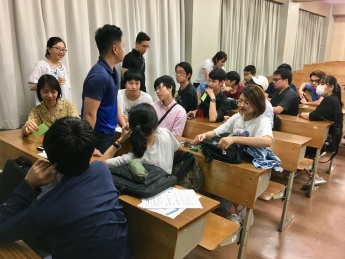 引き続き、インターナショナルセンターより、在籍確認、後期の授業、アルバイト等、夏季休暇から後期の授業開始にかけてやるべきこと、注意点等を説明をしました。最後には、10月に開催される大学祭における各模擬店のリーダーの選出を行いました。各模擬店のリーダーが決定すると大きな拍手が起こり、留学生が大学祭での模擬店出店を楽しみにしている様子が伺えました。