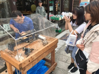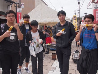 当日は大野市より指定された観光スポットから、御清水、越前大野城、武家屋敷旧内山家を見学しました。その後訪れた七間通りでは、事業者とのコミュニケーションは母国語でというミッションのもと、参加した留学生の母国語と英語を交えて食事を注文したり、大野市の特産物を購入しました。三大朝市物産祭りの開催日と重なり多くの観光客で賑わう中、事業者の方も単語を繋ぎ、身振り手振りで留学生へ商品の詳細を伝えてくださいました。